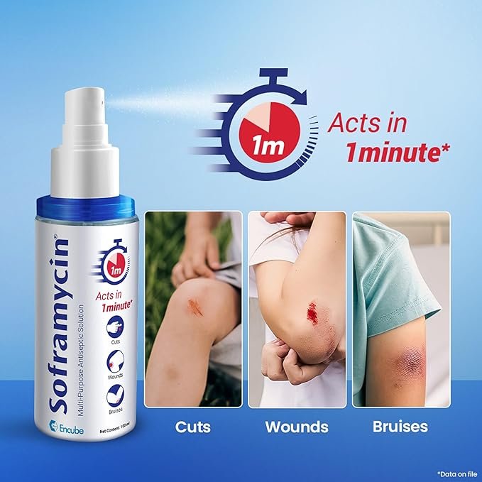 Soframycin Antiseptic Spray is your go-to first-aid solution for everyday cuts, wounds, and bruises. Clinically proven to act within just 1 minute (data on file), it offers fast and effective protection against infection. The convenient ready-to-use spray bottle ensures a no-touch, mess-free application—no dilution or prep required. Just spray and go!